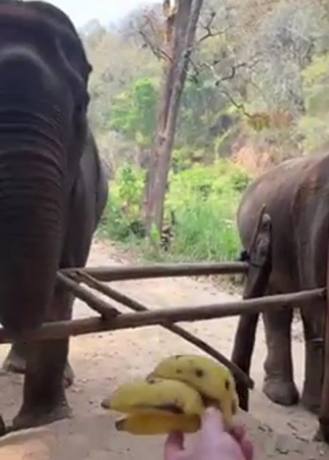 n elephant being fed bananas behind a wooden fence. The elephant is large and gray, and it uses its trunk to take the bananas from a person's hand. The fence is made of uneven wooden posts and planks. The background shows trees and green vegetation. The ground is sandy. The elephant's mouth is open after eating.