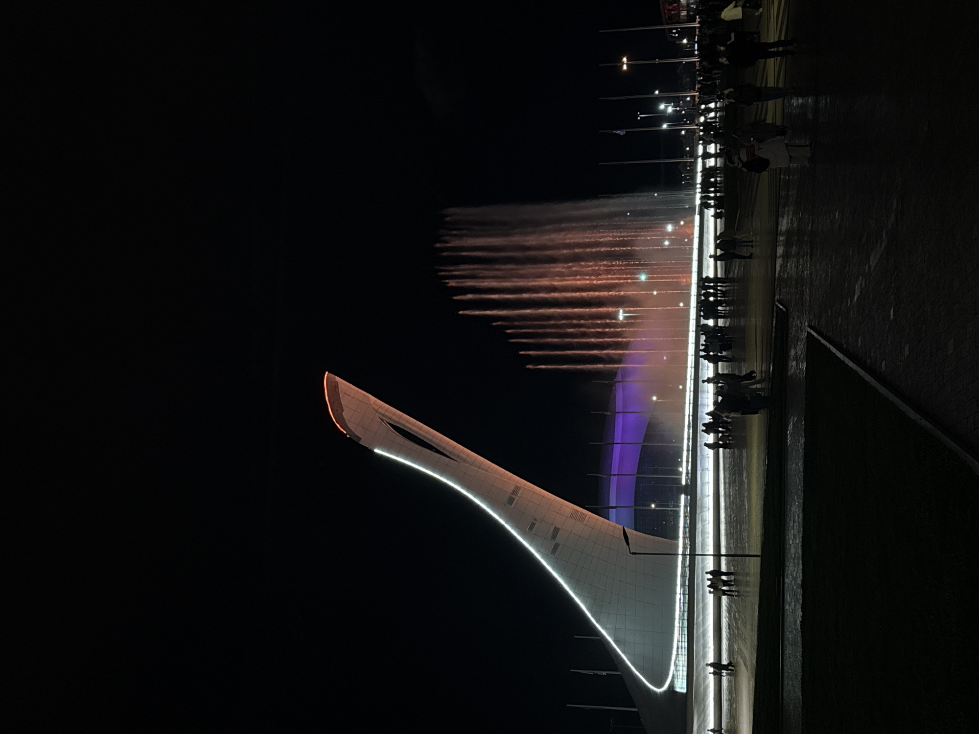 The image displays a nighttime scene in the Olympic Park in Sirius, Russia. The central feature on the left is the Olympic Torch Cauldron, a large, white, curvilinear structure illuminated with white light strips tracing its upward trajectory. Its upper section exhibits an orange-red glow, and an elongated oval opening is visible near its peak. To the right of the cauldron, a series of vertical water jets form part of a dancing fountain display, illuminated predominantly in orange and red hues. Behind both structures, a building with a purple-lit facade is discernible. The ground in the midground and foreground is a wide, paved plaza, appearing wet and reflective, suggesting recent rain or spray from the fountains. Numerous dark silhouettes of individuals and small groups are dispersed across this plaza, standing and observing the display. Overhead, the sky is dark. Several vertical poles, possibly flagpoles or streetlights, are present across the scene. Dark grassy areas are visible in the immediate foreground.