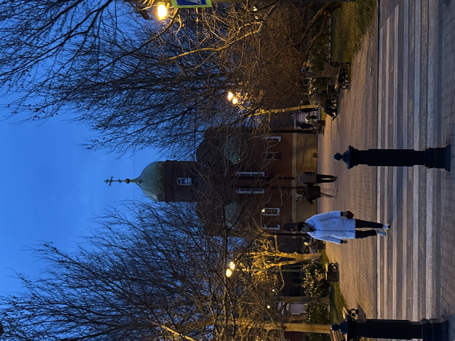 The image depicts a dusk or early night scene in Pushkin Square, Krasnodar, Russia. The central background subject is the Memorial Chapel of St. Alexander Nevsky, a reddish-brown brick structure featuring a prominent green dome topped with an Orthodox cross. The sky is dark blue, and artificial yellow-orange light from numerous streetlights illuminates the scene. Bare trees with visible branches line paved pedestrian pathways that converge towards the chapel. Park benches are situated along these paths. In the immediate foreground, a pedestrian crossing with white zebra stripes is visible, framed by two dark bollards. A female individual, wearing a light-colored long coat, dark pants, and white shoes, is actively walking across the pedestrian crossing from left to right. She holds a small red object in her left hand. Further down the left pathway, two individuals are seen walking away from the camera towards the chapel; one has a lighter face covering. A small, dark-colored dog walks near these two individuals. On the right pathway, an individual is seated on a park bench, facing away from the camera, with their feet resting on the bench. Additional indistinct figures are present in the deeper background near the chapel.