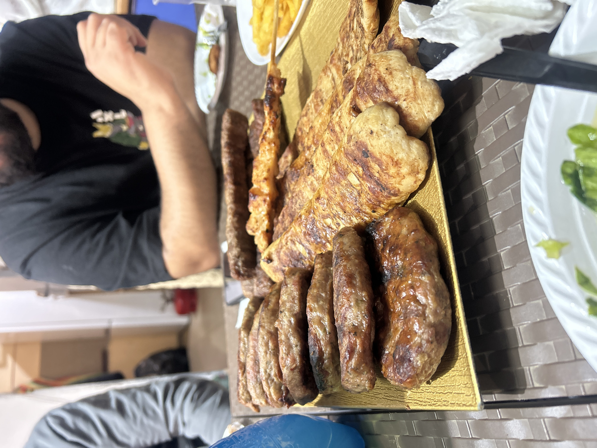 - "A man in a black t-shirt sits at a table with a golden tray of grilled meats, including sausages, kebabs, and flatbread" by FM-qtGFX2, licensed under CC BY 4.0