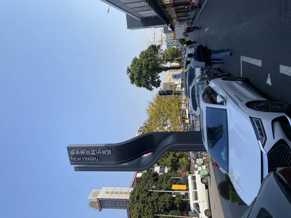 A street view shows a lineup of cars, a white vehicle prominently in the foreground. A large sign with "NEW YINGFU" in English and Chinese characters stands on the side of the road. A few pedestrians are visible further up the street. Buildings, trees, and a traffic light are also present. The sky is blue.