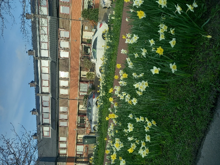 The image displays a residential street in The Hague, Netherlands, under clear daylight conditions. The foreground features a vibrant patch of green grass densely populated with blooming white and yellow daffodils, bordering a dark grey paved surface to the lower left. In the midground, a narrow strip of reddish-brown ground precedes a row of parked vehicles and the fronts of residential buildings. A silver hatchback is parked on the left, adjacent to a green utility box. Further right, a white two-door coupe is parked. The background is occupied by a row of attached, multi-story brick houses. These buildings exhibit reddish-brown brickwork on their lower levels and darker brick on upper sections, featuring multiple light-framed windows. The dark grey, sloped roofs are fitted with numerous dormer windows, chimneys, and solar panels. Bare tree branches are visible against a blue sky in the upper left and right corners of the frame. No individuals are present. The scene suggests springtime.