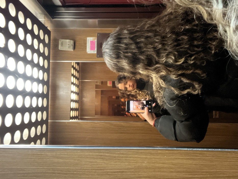 The image depicts the interior of an elevator within a building in València, Spain. A person, viewed primarily from behind, is centered in the frame, taking a mirror selfie with a black smartphone held in their right hand. This individual has long, curly, multi-toned brown hair with lighter highlights, cascading over their shoulders and upper back. They are wearing a black puffer jacket, and a red string bracelet is visible on their right wrist. The elevator's interior features light brown wood-grain panels on the walls with metallic vertical trim. The ceiling consists of a dark panel embedded with multiple rows of circular, illuminated, recessed light fixtures. A mirror on the elevator's back wall reflects the person, showing their front profile with a slightly pursed-lip expression. The reflection also shows the smartphone screen displaying a recursive image of the selfie being taken. To the right of the mirror, a wall panel contains a small, light-colored rectangular device mounted above a darker control panel, which has a small pink sticky note affixed to it. Deeper reflections within the mirror indicate an interior hallway or room with warm lighting outside the elevator.
