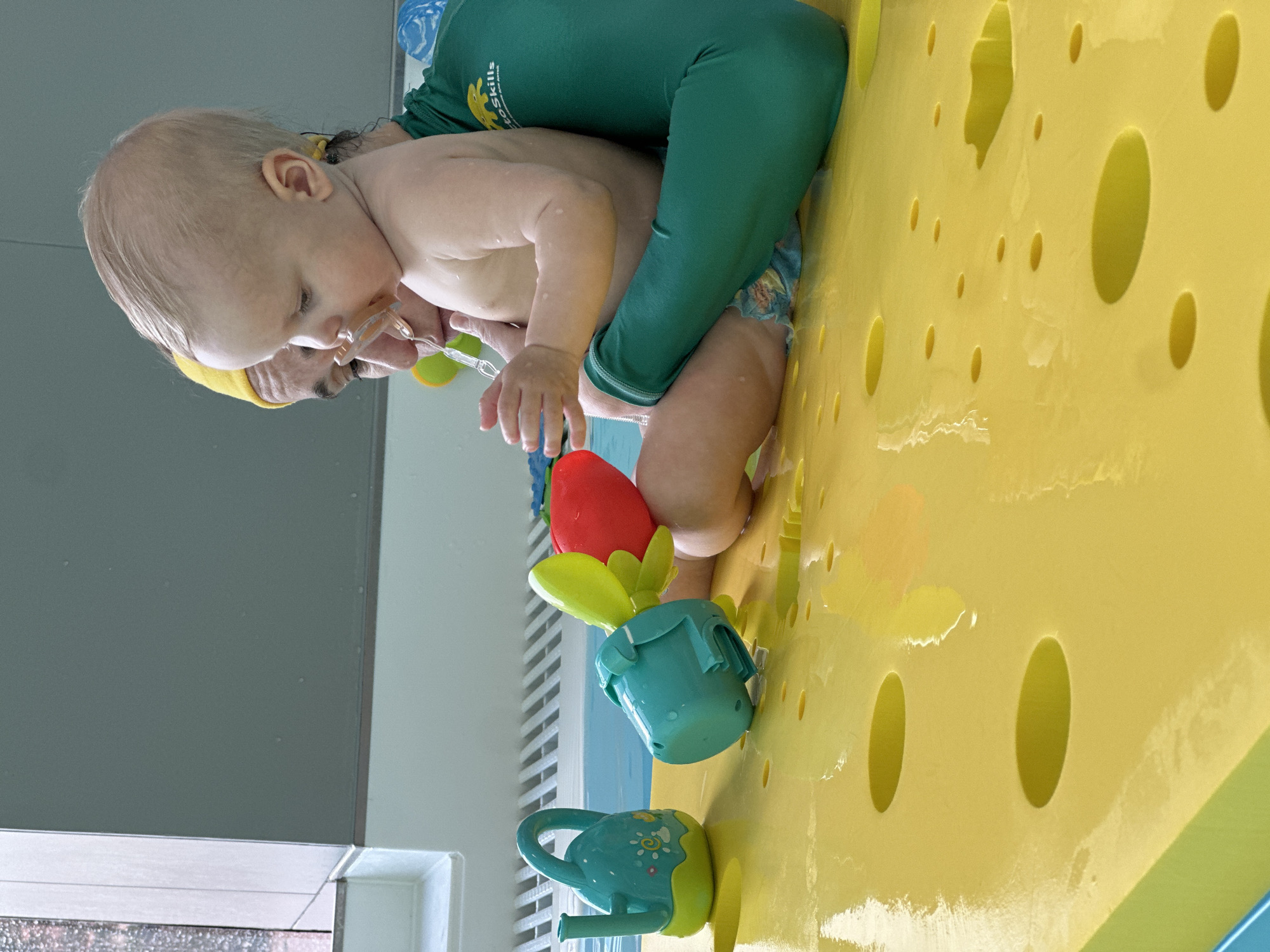 A baby is positioned against a yellow, porous surface with a woman in green leggings. The baby is fair-skinned and appears to be in a diaper. The woman wears a yellow headband and has dark hair. Both are near water play toys, including watering cans and a red object resembling a vegetable. The location is a swimming pool in Khimki, Russia.
