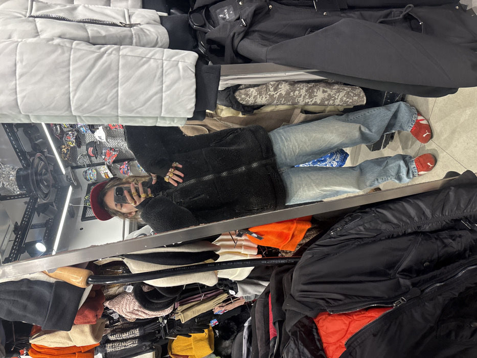 This image depicts an indoor scene within a retail clothing store, presented as being located in Strasbourg, France. A single individual, appearing to be female, is captured in a mirror selfie. The person is wearing a red baseball cap, a black textured fleece jacket with a central zipper, light blue baggy jeans, and red athletic shoes with white detailing. Multiple rings adorn the fingers of both hands. The individual is holding a smartphone with their left hand, angled towards the mirror to take the photograph, while their right hand rests near the center of their chest. The retail environment is densely filled with merchandise. To the left of the mirror, various hats and beanies in colors such as black, orange, yellow, and beige are displayed on racks. A black bomber jacket with a bright orange quilted lining is partially visible in the lower left foreground. To the right of the mirror, a light grey puffer jacket hangs prominently, alongside a black hooded parka with a visible hang tag. Additional clothing items, including patterned fabrics, are visible on racks and hangers throughout the background. The ceiling features track lighting and a circular ventilation fixture. The floor is a light-colored tile or concrete.
