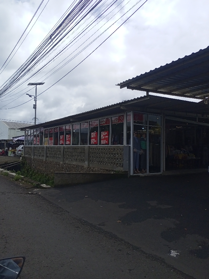 A daylight photograph captures a street scene in the city of Meyong, India, under an overcast sky. The primary subject is a single-story commercial building, presumably a retail store, featuring a long glass facade with multiple windows. Red rectangular signs displaying white text, including the brand "VANS," are affixed to these windows. The building is topped with a corrugated metal roof, and an additional, slightly elevated corrugated metal awning extends over the right section of the structure. A concrete retaining wall with a decorative, open-block pattern runs along the building's base, separating it from a lower ground level with a visible drainage channel and some green vegetation. Two mannequins, one dressed in a blue denim jacket and dark pants, the other in a green top, are positioned inside the store near an open glass entrance on the right. In the foreground, a dark asphalt road occupies the lower portion of the frame, showing some lighter patches consistent with moisture or puddles and scattered white debris. To the left, a tall grey street light pole equipped with a solar panel and a light fixture stands beside the road. Further in the background on the left, a white building is partially visible, along with other indistinct structures. Numerous black electrical power lines stretch diagonally across the upper section of the image against the grey, cloudy sky. A reflection, consistent with a vehicle's mirror, is partially visible in the extreme bottom-left corner.