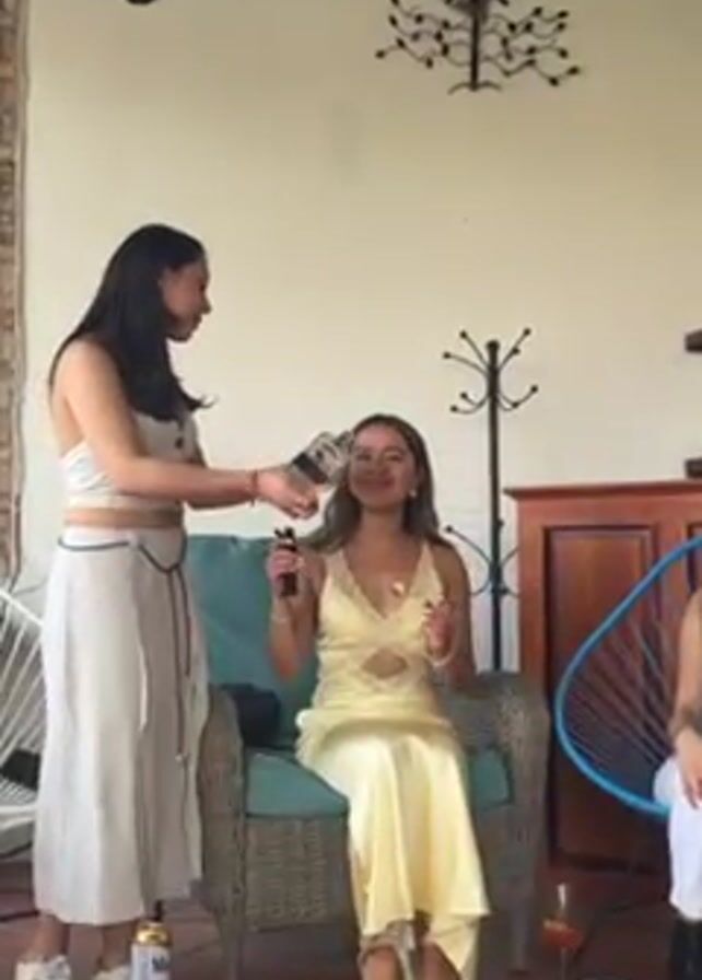 two women, likely at a party. One woman is holding a bottle and pouring liquid into the mouth of the second woman. The second woman is seated in a blue armchair. The scene is outdoor, possibly on a patio, and other people are seated in the background. The woman pouring the drink is wearing a tan two-piece outfit, while the other woman is wearing a yellow dress. There are beer cans and cards on the floor near them.