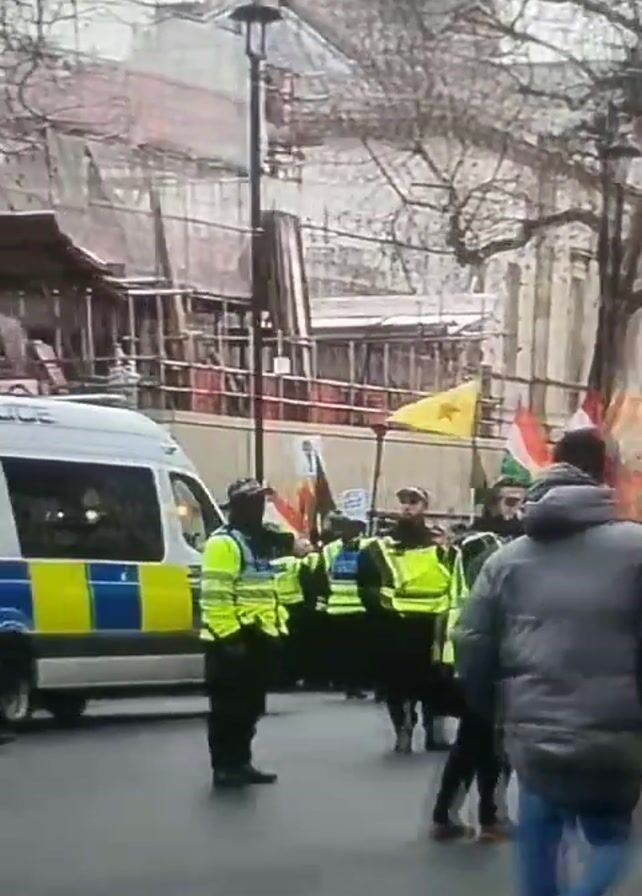 The video depicts a street scene with a protest or demonstration taking place. Many people in bright yellow vests, likely police or security personnel, are lining the street. Some are standing near a white police van. A group of people are carrying flags that appear to be the Kurdish flag. In the background, there is a statue of a man on a horse. Buildings are visible in the background, as are bare trees indicating it could be winter or early spring. The overall scene suggests a planned event under police supervision in an urban setting.