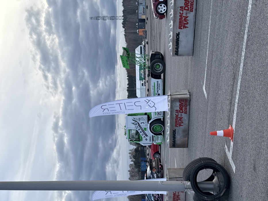 The image depicts an outdoor paved area, identified as a location in Wolica, Poland, under an overcast sky with dense gray clouds. In the foreground, a tall gray pole occupies the left side, with two black tires secured at its base on the asphalt. To the right of the pole, an orange and white traffic cone rests on the asphalt, which is marked with white painted lines. The midground features a custom-painted white and green cab-over-engine racing truck, displaying a prominent number "3," "MADREX," "MAHLE," and "PETRONAS Urania" branding. Its wheels feature green accents. A large, bright green multi-plane spoiler is mounted on the rear of the truck's chassis. To the left and right of the truck, several white feather flags are visible, with reversed text; one clearly shows "SETES" and another "G.Madry AUT." Dark gray concrete barriers with white tops are arranged horizontally across the midground. These barriers are emblazoned with red text: "MANNOL" and "FUNDACJA FUN AND DRIVE DZIECIOM." Other vehicles, including a dark-colored sports car with a spoiler and a red car, are partially visible behind the truck and to its left. A maroon car is partially visible on the far right side of the frame. The background consists of a dark tree line. Beyond the trees, a tall metallic power pylon with power lines extends into the sky on the right. Further in the distance, white tents and several portable structures are present. No individuals are visible.