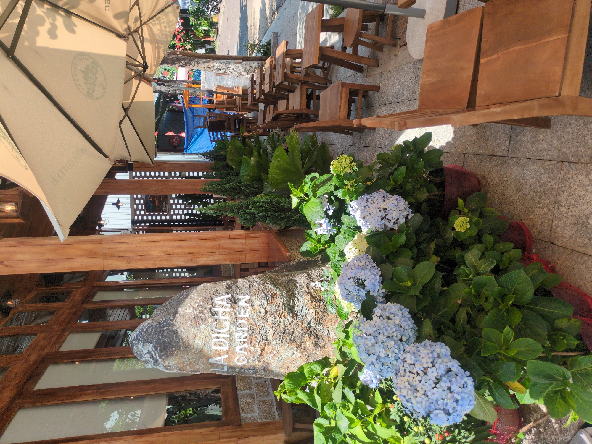 The image captures an outdoor seating area of a restaurant or cafe in South Quy Nhon Ward, Vietnam. A large parasol shades wooden tables and chairs arranged along the sidewalk. A stone planter with "LA DICHA GARDEN" inscribed on it sits near the building, filled with blooming hydrangeas and greenery. In the background, more seating and street activity can be observed.
