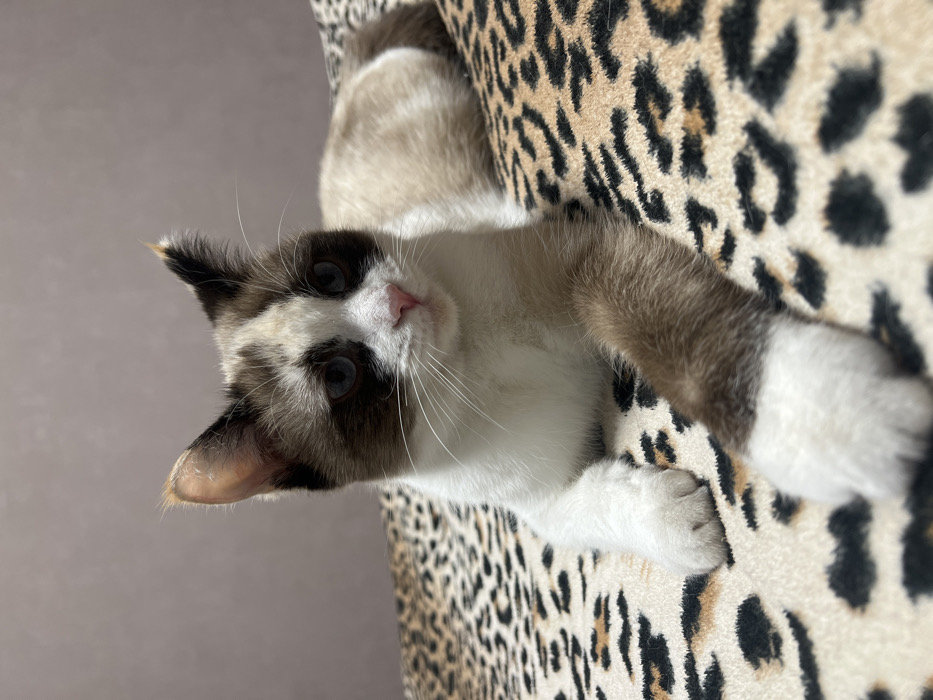 The image depicts a domestic cat lying on a patterned blanket in an indoor setting. The scene is situated in what is stated to be Votkinsk, Russia, though no specific visual identifiers for this city are present within the frame. The cat is a medium-sized feline with a distinctive colorpoint coat pattern, featuring a primarily white body with brown-cream coloration on its extremities. It exhibits dark brown markings around its blue eyes, forming a partial mask, and has a pink nose. Its ears are tipped with brown, and the right front leg shows brown fur blending into a white paw, while the left front leg is predominantly white. The cat's tail also appears to have brown markings. It is lying in a relaxed, prone position, with its front paws extended forward. The animal's gaze is directed slightly to the right of the frame, indicating an alert but calm demeanor. The cat rests on a tan and dark brown leopard-print blanket or bedding, which occupies the majority of the foreground and midground. The background consists of a plain, light-colored wall, likely beige or light gray, with no visible furniture or other objects. The lighting appears to be ambient, illuminating the scene uniformly. No other subjects or interactions are visible.