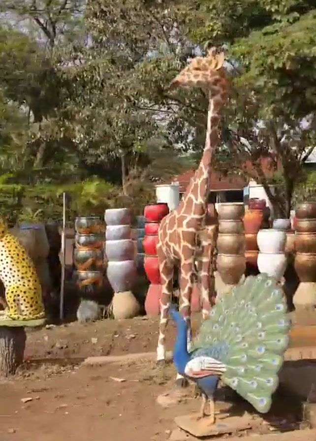 The camera pans slowly across an outdoor landscape featuring a variety of crafted items and natural elements. Starting with a focus on animal statues – a cheetah, a giraffe, and a peacock – the camera reveals a bus stop with a Fanta advertisement. Piles of stacked and painted tires are visible in the background. As the camera moves, it showcases racks of different sized and styled clay pots. The scene also includes sculpted tree branches, adding to the overall aesthetic of an outdoor art installation or a garden center display.