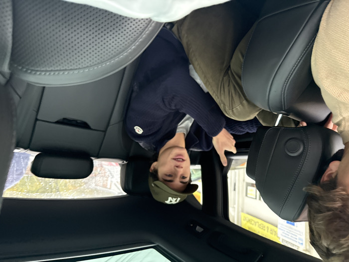 interior of a vehicle, viewed from a rear passenger perspective, looking forward and to the right. In the foreground, the back of a male subject's head and left shoulder are visible, seated in the front passenger seat. He has light brown, wavy hair and wears a light-colored top. The black leather headrest of his seat, featuring a circular control, is prominent. In the right rear passenger seat, a young male subject is seated, actively speaking and gesturing with his raised right hand. He has dark hair, a light complexion, and wears an olive green baseball cap with a light-colored logo (appears to be "KT" or "NT"). He is dressed in a dark blue zippered jacket, likely a Moncler brand given the visible arm patch, over a light-colored t-shirt, and olive green pants. His legs are extended forward. The vehicle's interior features dark leather seating and a sunroof visible on the ceiling. Outside the vehicle's right passenger window, a white building is visible, indicating an urban or suburban commercial area in Waltham, Massachusetts, United States. The window exhibits moisture, suggesting overcast or rainy weather. Prominent signage on the building includes a white rectangular sign with black text reading "AUTO REPAIR & REPLACEMENT" and "ALIGNMENT." Above this, a blue rectangular sign, partially obscured, appears to display "OFFICIAL VEHICLE INSPECTION STATION." The scene captures a conversational interaction within the vehicle, parked or stopped next to an auto repair and inspection facility.