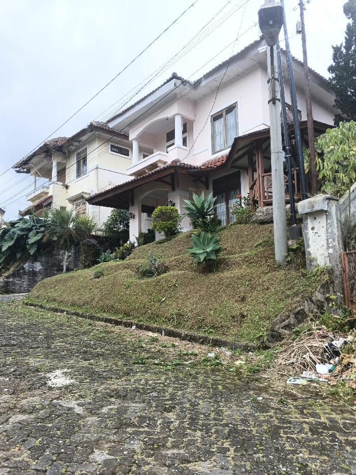 This image depicts a residential street scene in the city of Saisetha, Laos, under an overcast sky. The foreground features a dark, damp paved road composed of interlocking pavers, with sparse green vegetation growing through cracks. A low curb separates the road from an ascending, well-maintained grassy slope that dominates the midground. Several agave-like succulents and smaller shrubs are planted on this slope. To the immediate right in the foreground, a pile of refuse, including branches, leaves, and plastic debris, lies adjacent to a concrete pillar and a partially visible rusty gate. Two two-story detached houses are visible uphill, set back from the road on the elevated terrain. The most prominent house, on the right, exhibits light pink exterior walls, a brown tiled roof with white eaves, and a covered ground-floor porch featuring a dark brown wooden roof supported by wooden posts. This house has wooden-framed double doors on the ground level and two upper-story windows with light frames and security grates, alongside a small, columned balcony. A utility pole with multiple overhead wires stands vertically in front of this house, on the right side of the frame, topped with a street light fixture. Further uphill and to the left, a second, slightly paler cream or yellow-colored two-story house is visible, also with a brown tiled roof and a prominent second-story balcony supported by white columns. Large, dark green leafy plants grow at the base of a concrete retaining wall in front of this house, contributing to the dense vegetation. No individuals or active interactions are present in the scene.