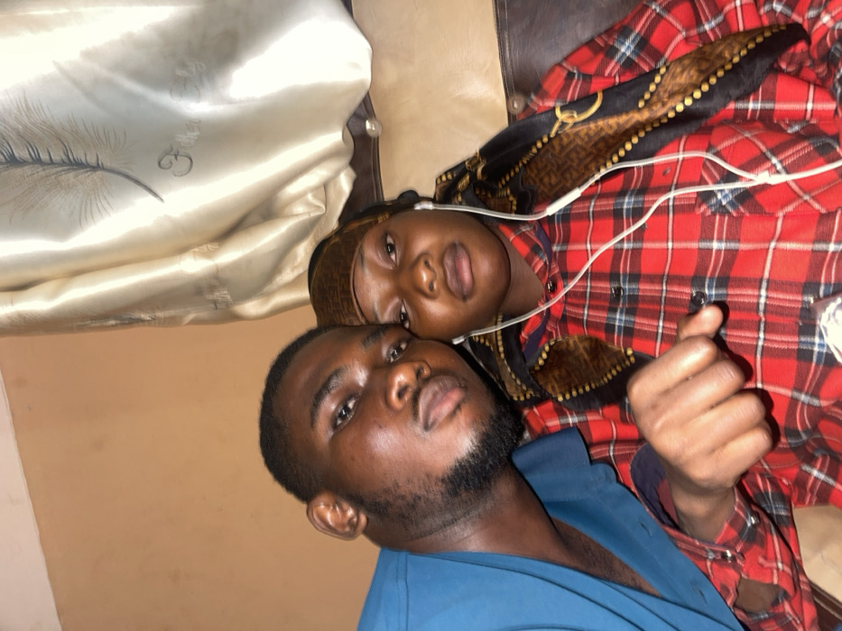A man and a woman pose close to each other. The man, with a beard and wearing a blue shirt, looks upward. The woman, with a head covering and a red plaid shirt with a brown scarf, lies beside him. White wired earbuds are visible, and the woman's hand is slightly raised. The setting appears to be indoors, possibly on a couch with a tan wall and a cream-colored, patterned blanket nearby.