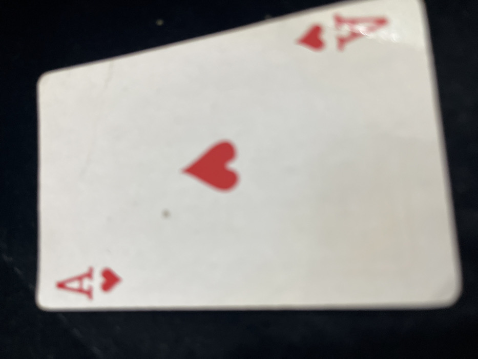The scene is situated in Rishon LeZion, Israel. The primary subject is a single playing card, identified as the Ace of Hearts, positioned diagonally on a dark, undifferentiated surface. The card is predominantly white with red markings, including a large central heart symbol and smaller 'A' letters with corresponding heart symbols in the top-left and bottom-right (inverted) corners. The card exhibits minor surface wear, including faint discolorations and a small dark speck near its center. The background is a blurred, dark field, appearing black or very dark grey, suggestive of a matte surface. No individuals or actions are depicted.