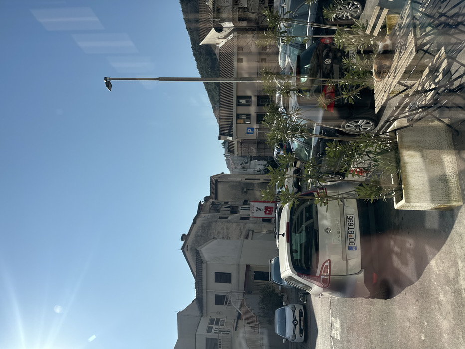 The image depicts an outdoor urban scene in Budva, Montenegro, observed on a bright, sunny day. The perspective appears to be from inside a building, with reflections visible on a pane of glass in the lower right quadrant. In the immediate foreground, a light-colored concrete planter containing small green leafy plants is positioned, with a wooden outdoor table and matching folding chairs to its right. A calico cat is resting on the wooden table. The midground consists of a paved street or parking area densely occupied by numerous parked vehicles. A silver Renault Scenic multi-purpose vehicle (MPV) with Montenegro license plate "BD BT695" is centrally positioned, facing away from the viewer. To its left, a white Renault Clio bearing license plate "BD CG222" is parked. Multiple other passenger vehicles, predominantly dark-colored sedans and hatchbacks including a black Volkswagen Golf, are parked throughout the area. A tall, gray streetlamp stands on the right side of the frame, and a blue rectangular parking sign with a white "P" is visible further back among the vehicles. The background features several multi-story residential or commercial buildings with light-toned facades and terracotta-tiled roofs. A building on the left exhibits external concrete stairs. A red and white vertical banner sign, partially obscured by a vehicle, displays the text "VET MEDICA". The horizon reveals a clear, bright blue sky above a range of green, tree-covered hills or mountains. No individuals are visible within the frame.