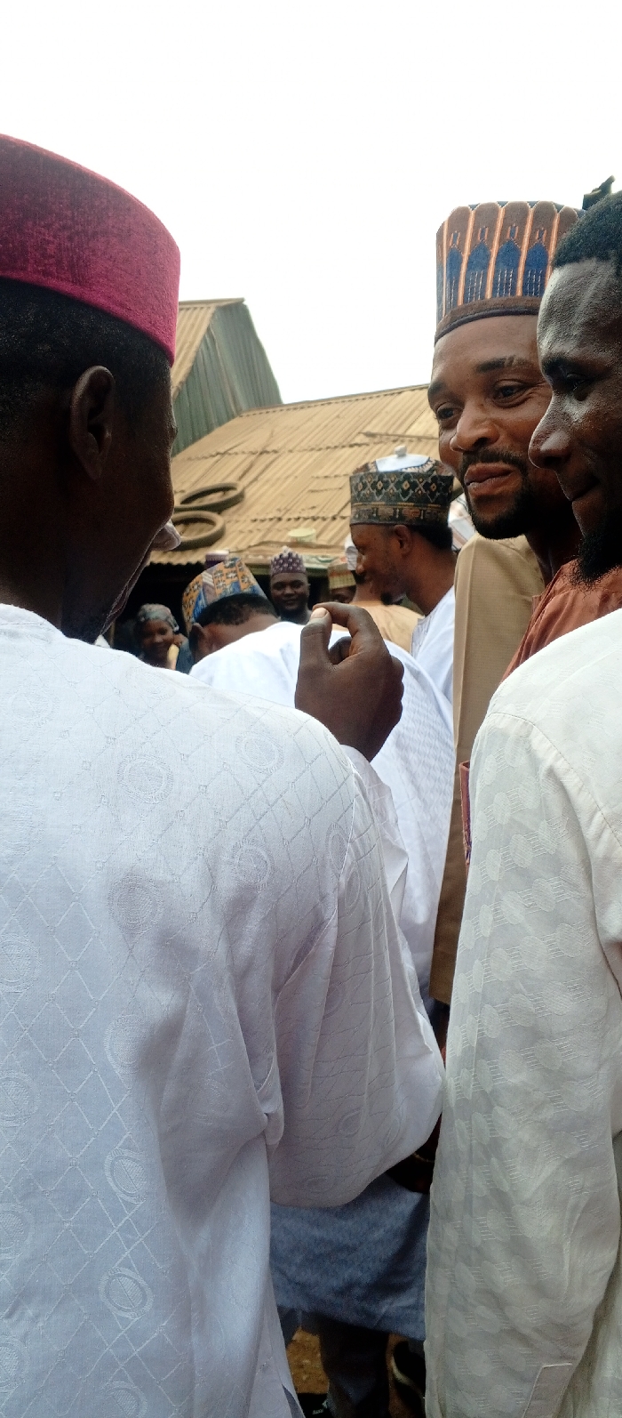 The image depicts a social gathering of approximately eight individuals, primarily men, in an outdoor or semi-outdoor setting within the city of Toto, Nigeria. In the foreground, the back of a person's head wearing a dark red velvet cap and the shoulder of a white patterned garment are visible. This individual's right hand is raised, with fingers slightly curled, positioned in the lower-center of the frame. To the right of this individual, the partial profiles of two men are visible. One, in the mid-ground, wears a patterned brown and blue cap, a light brown garment, and is smiling while looking towards the foreground left. Adjacent to him on the far right, a second man with a beard and short dark hair, wearing a brown garment, is also smiling and looking towards the foreground left. Several other individuals are present in the background, mostly blurred, but a few are distinguishable. One man in the center-background wears a patterned cap and is smiling. Another person, slightly to the left of center in the background, has a light complexion and is also smiling. Most visible participants are wearing traditional Nigerian attire, including various patterned caps and light-colored, often white, garments with subtle embossed patterns. The background features corrugated metal roofs of buildings, suggesting a residential or commercial area. One roof appears light brown/orange, and another is a darker green/grey. A stack of dark, circular objects, possibly tires, is discernible on one of the roofs. The sky above is bright and overcast, appearing white. The overall scene suggests a casual social interaction, possibly a conversation, with multiple individuals exhibiting positive expressions.