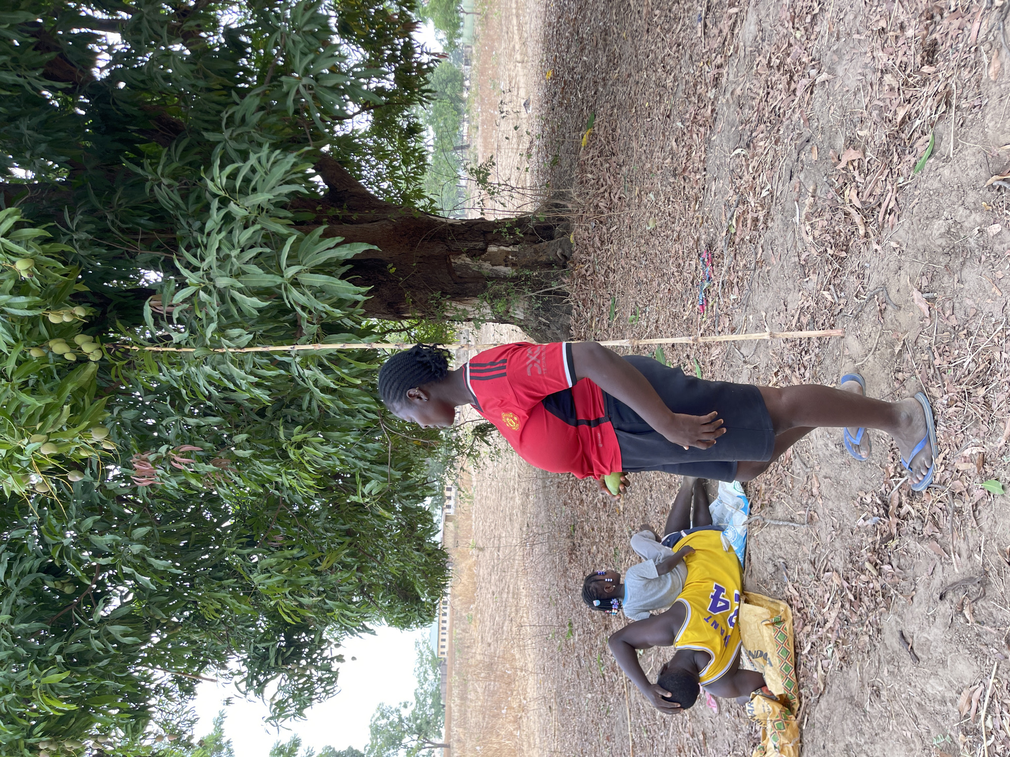 In Akwanga, Nigeria, a scene unfolds under a large mango tree laden with unripe fruit. A dark-skinned woman stands upright on the right, wearing a red short-sleeved shirt with black stripes and a Manchester United logo, black shorts, and blue flip-flops. Her hair is braided. She holds a long, slender, light-colored pole vertically in her left hand and a single green mango in her right hand, looking towards the right. To her left and slightly behind her, a dark-skinned man lies on his back on a yellow and blue mat or bag. He wears a yellow tank top with a number "42" and "LAKERS" branding, and dark shorts. His left arm is bent, with his hand supporting his head. A young child with dark skin sits on the man's abdomen, facing right, wearing a light grey t-shirt and light grey pants. The child's hair is braided with colorful beads, and white markings are present on its left cheek. The ground is dry, reddish-brown earth covered with a dense layer of fallen brown leaves and some small branches. In the mid-ground, a vast expanse of dry, yellowish-brown field with sparse vegetation is visible. In the distant background, light-colored, multi-story buildings with dark roofs are partially visible, surrounded by other trees.
