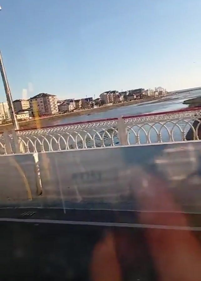 moving perspective from inside a vehicle, likely a bus or car. The view is through a side window, looking out at a bridge with a decorative white railing and concrete barriers. Beyond the bridge is a body of water, and on the opposite shore are residential buildings under a clear blue sky. Cars pass by on the bridge. A road sign indicating a weight limit of 8 tons is visible.