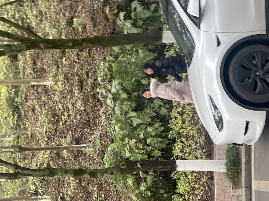 This image captures a street scene in Jiangjin, China. The foreground features the front-right quarter of a white Tesla vehicle, displaying its headlight, front bumper, and a black multi-spoke wheel with a visible Tesla logo. A paved sidewalk or street runs along the bottom, bordered by a curb and sparse greenery. To the left of the vehicle, a tree with a portion of its trunk painted white stands on the sidewalk. In the midground, two East Asian females are visible, walking or standing behind the Tesla. The woman on the left wears a light pink hooded puffer coat with a fur-trimmed hood. The woman on the right wears a black puffer coat and a dark scarf. Both individuals are looking generally forward or slightly towards the camera's left. The background consists of a steeply sloped, heavily vegetated hillside. Numerous trees with slender trunks are interspersed among dense ground cover, including ferns and various leafy plants in shades of green and brown.