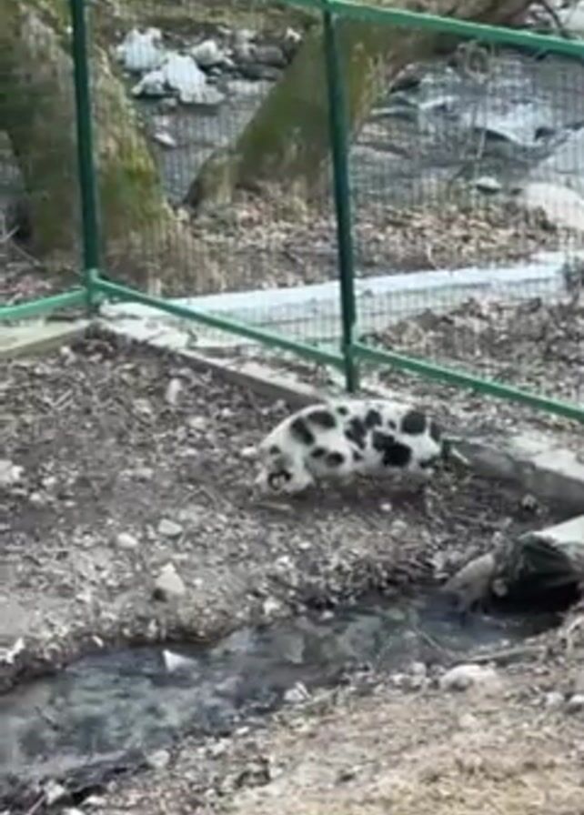 small, spotted pig walking around a muddy enclosure next to a small stream. The enclosure is surrounded by a green metal fence. The environment appears to be a wooded area, with trees and some snow visible in the background. The pig is sniffing around in the mud near the stream.