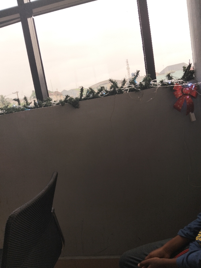 A room is partially visible with a chair in the lower left corner and a person seated in the lower right. A low wall runs horizontally across the middle, adorned with a Christmas garland, small white lights, and a red bow on the right side. Light is coming from a large window at the top, revealing a cityscape in the distance under a cloudy sky.