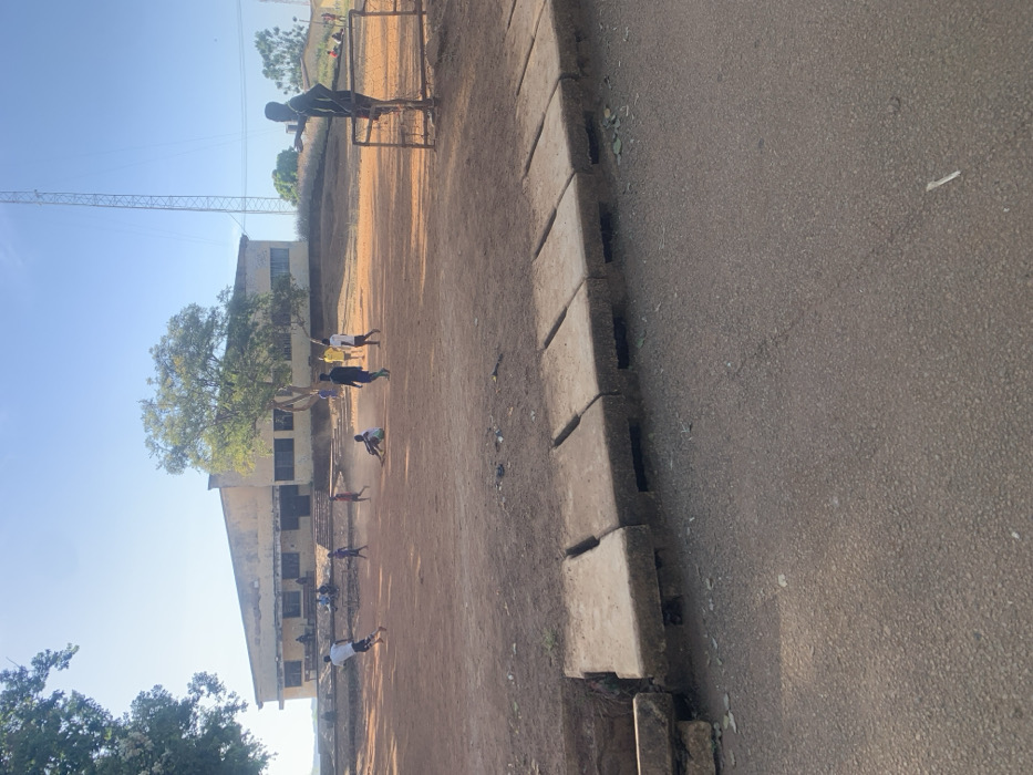 This image captures an outdoor scene in Rafin Par, Nigeria, under a clear blue sky. The foreground features a dark asphalt road separated from a reddish-brown dirt field by a series of misaligned, light grey concrete drain covers. The midground is dominated by the dusty dirt field where approximately ten to twelve individuals, primarily young males, are present. Several are in motion, suggesting a game of football (soccer), with one individual in a white shirt running leftward and another in a yellow shirt centrally. One person is seated on the ground, creating a small dust plume. On the far right, a dark, rusted metal goalpost, without a net, is visible. A tall individual in dark clothing stands by this goalpost, pointing towards the field. In the background, a weathered, two-story, light-colored building with dark windows and a sloping roof stands; a central staircase leads to an entrance, with several people observed on the steps and at its base. A large tree with green foliage is positioned left of center. To the right of the building, a tall, metallic lattice communication tower extends skyward.