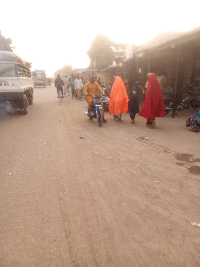A street scene shows a man on a motorcycle traveling along a dirt road. Alongside him, a woman in a bright orange veil and another in a red veil walk with a small child. In the background, a truck emits exhaust fumes, and other people are present, including a man on a bicycle. Buildings line one side of the road.