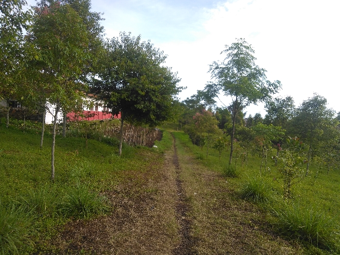 The image displays an outdoor scene in Røros, Norway, featuring a narrow dirt path that ascends gently uphill and veers slightly to the left, receding into the distance. The path exhibits areas of exposed earth interspersed with sparse green vegetation. Flanking the path on both sides are grassy slopes abundantly covered with green foliage, including numerous young deciduous trees of varying sizes. On the left side, a building with a white upper section and a visible red lower portion or roofline is partially visible through the trees in the mid-ground. The right side of the path presents a dense collection of smaller trees and shrubs. The upper portion of the frame shows a bright, largely clear sky, indicating daytime conditions. There are no individuals, animals, or discernible activities present in the scene.
