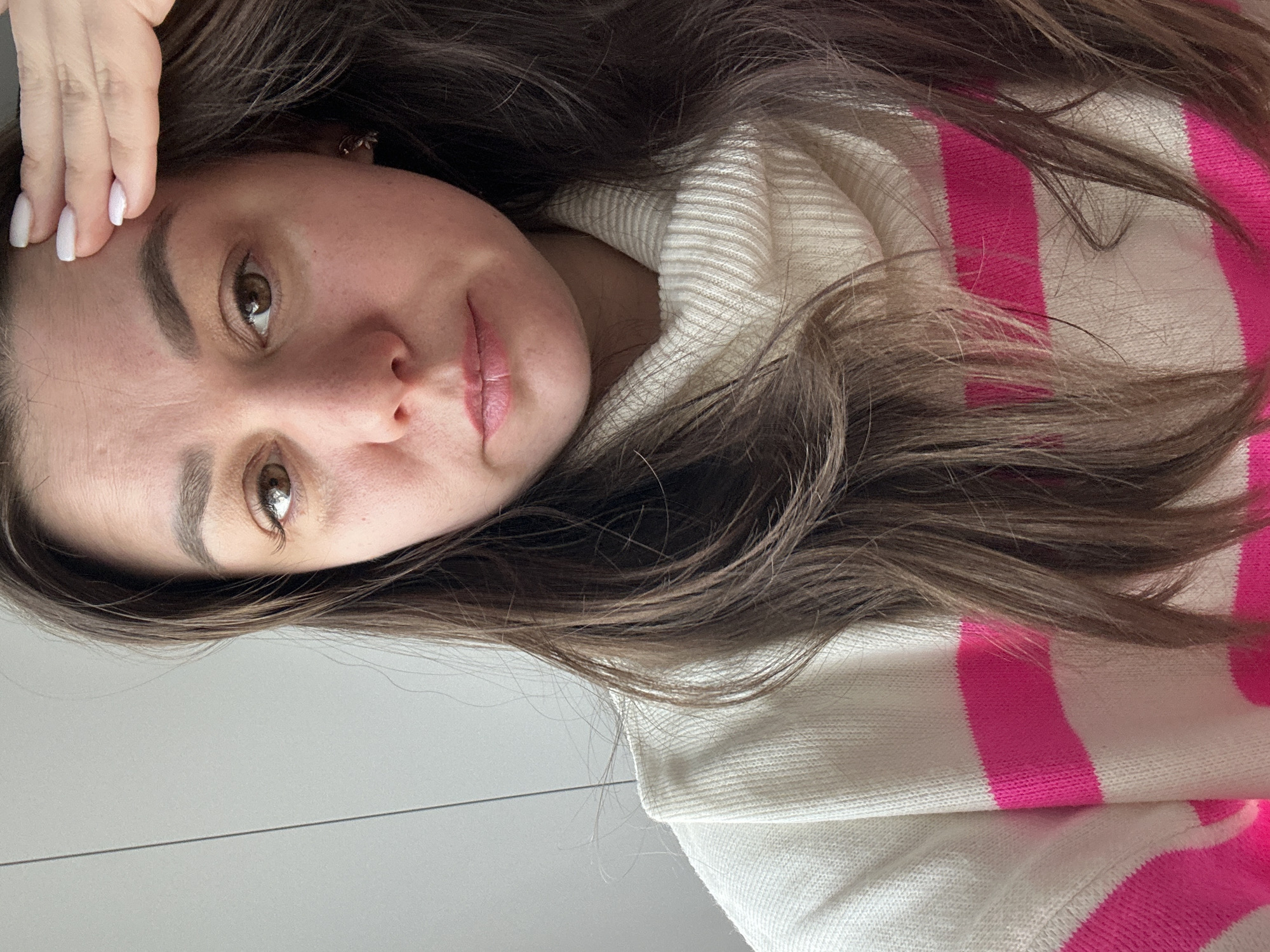 A selfie of a young woman wearing a white and pink striped sweater
