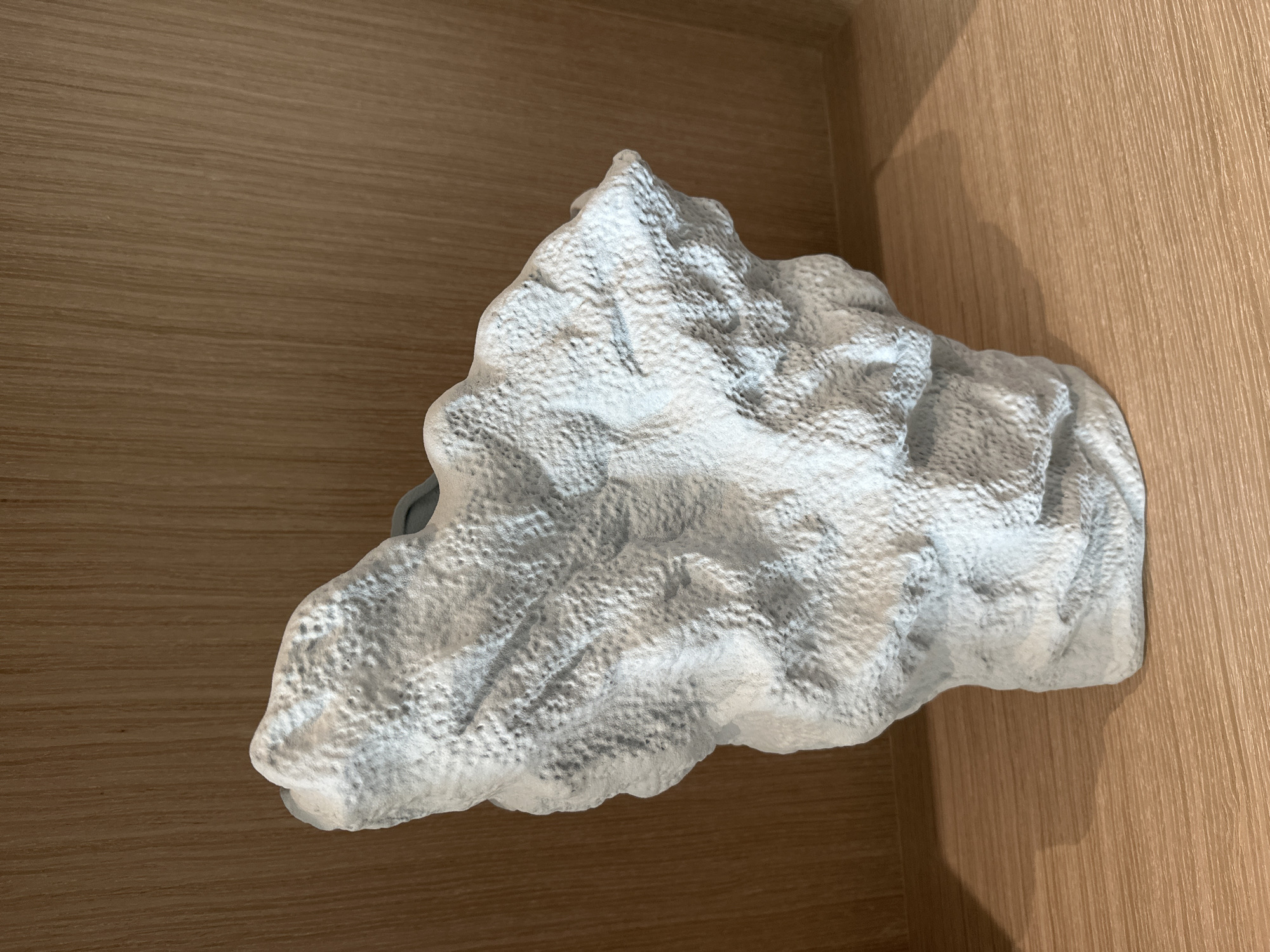 A textured, irregularly-shaped, gray and white object is positioned on a light brown surface that appears to be a wooden shelf