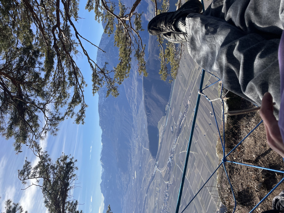 The image presents a first-person perspective from a high vantage point overlooking a vast valley landscape, identified as being in or near Aldein - Aldino, Italy. The scene is viewed from a rocky cliff edge, partially framed by the dark green needles and branches of pine trees in the upper and foreground sections. The environment includes a clear blue sky with thin, wispy white clouds. In the mid-ground and background, multiple layers of mountains are visible; the furthest peaks show patches of snow, while closer mountains are dark and forested. The expansive valley below is characterized by a precise grid pattern of numerous agricultural fields, predominantly light brown, consistent with vineyards. A river, appearing as a narrow blue line, runs through the valley, paralleled by a major road (likely an autobahn) and several smaller roads. Scattered settlements with buildings are visible across the valley floor. In the immediate foreground, the lower body of an individual is visible. The person is wearing greyish-black jeans, white socks, and black hiking boots. Their legs are extended, resting over a structure composed of interconnected blue ropes, forming a net-like barrier or platform secured to the rocky ground at the cliff's edge. The individual's left hand is visible, partially covered by a purple sleeve, holding a slender, hand-rolled cigarette with a lit tip. The posture suggests the person is seated or reclined, observing the panoramic view.