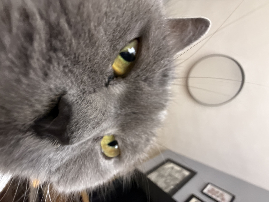 - "A close-up, low-angle photograph features the face of a gray domestic cat, occupying the majority of the frame" by FM-XR4443, licensed under CC BY 4.0
