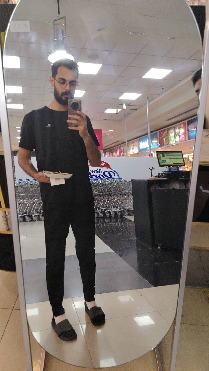 The image depicts a male individual captured in a mirror selfie, located within a supermarket or grocery store in Barza Municipality, Syria. The subject is an adult male with short dark hair, a full beard, and a mustache, wearing round-rimmed glasses. He is dressed in a black short-sleeved t-shirt, possibly bearing a white logo (partially visible as "DOMYOS"), black athletic-style pants, and dark-colored slide sandals worn over white socks. In his right hand, he holds a smartphone, likely the device used to capture the image, with its camera lens facing him. His left hand holds a small white plate containing an unidentified food item, with a white receipt tucked underneath. The environment reflected in the mirror reveals a brightly lit retail space. The floor is tiled with light-colored (beige/white) squares, interspersed with darker (black/grey) sections, reflecting the overhead illumination. The ceiling features a grid pattern with numerous rectangular fluorescent light panels and at least one suspended industrial-style lamp directly above the subject. In the background to the subject's left, multiple rows of nested metal shopping carts are visible. Behind these carts, a large red and white sign with the partially visible text "New D..." is present. To the subject's right, a point-of-sale (POS) counter is visible, equipped with a computer monitor displaying a green graphical user interface, a scanner, and other peripherals. Beyond the POS counter, illuminated display shelves stocked with various packaged food products, including snacks, are evident. Overhead signs, including one with "Heal," are visible above these product displays.