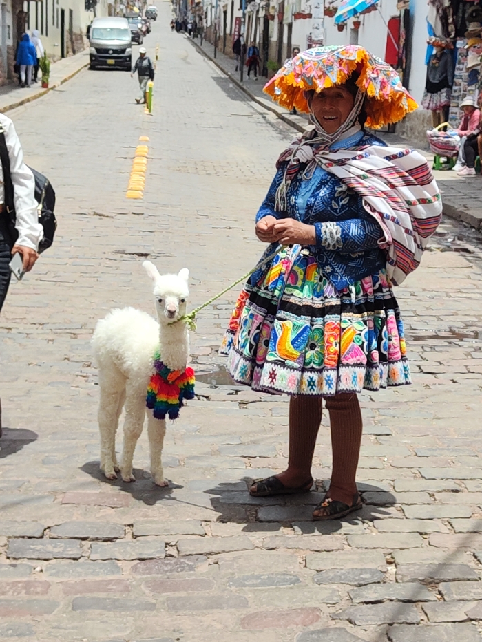 - "A woman in traditional Peruvian clothing, including a large hat and colorful skirt, stands on a cobblestone street, holding a white alpaca on a leash" by FM-20kwN2, licensed under CC BY 4.0