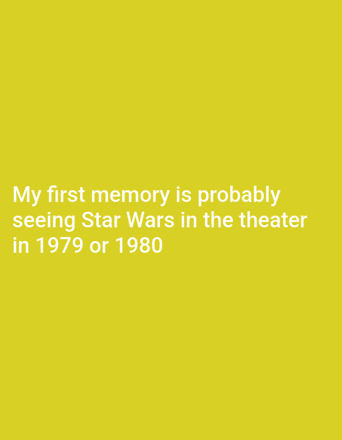 The image displays white alphanumeric text against a uniform yellow background. The text, centered horizontally in the lower third of the frame, reads: "My first memory is probably seeing Star Wars in the theater in 1979 or 1980". There are no individuals, objects, actions, or interactions depicted. The environment is solely the solid yellow color. The image provides no visual information, landmarks, or contextual cues to indicate a physical location, including the city of Lakewood, United States.