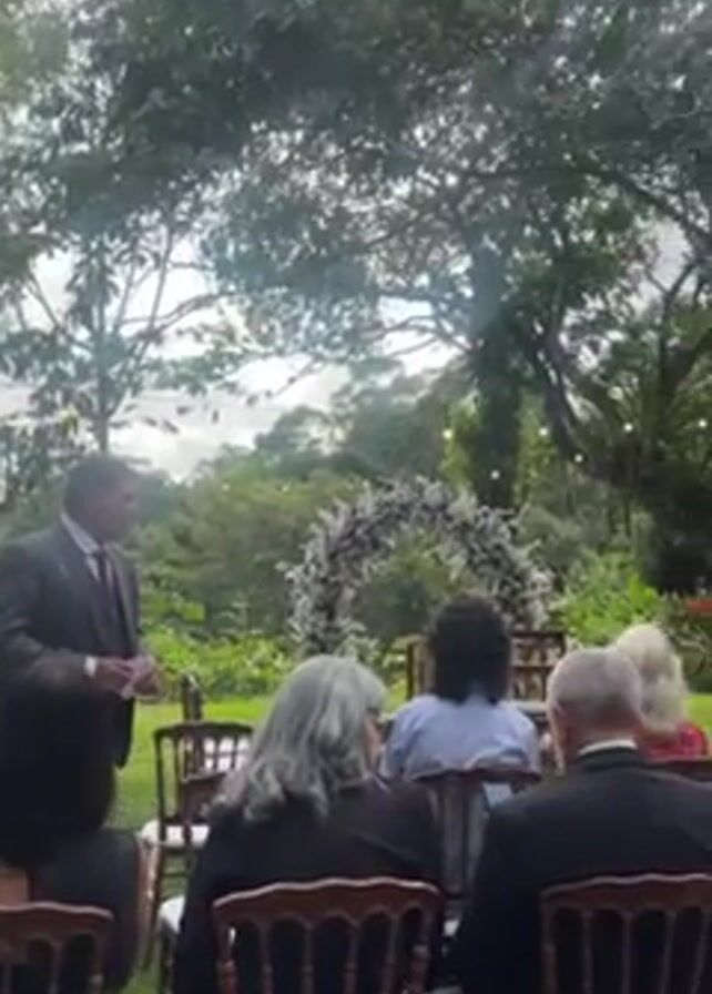wedding ceremony taking place in a garden or wooded area. There are rows of chairs set up on a lawn, facing a floral archway that serves as the backdrop for the ceremony. Guests are seated, facing forward. A man in a dark suit stands at the front, addressing the audience with a microphone. There is movement in the background as other individuals in formal attire approach the front. The environment appears to be lush with trees, greenery, and possibly some lighting strung in the branches.