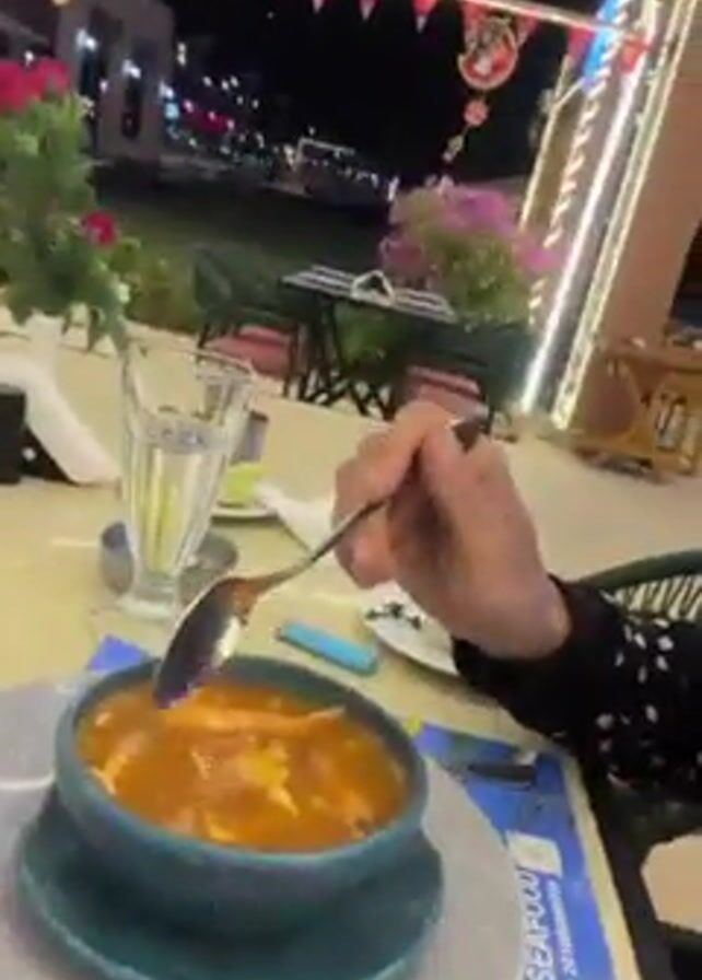 A man in a black polka dot shirt sits at a table outside a brightly lit restaurant, filming himself. On the table in front of him is a light blue bowl filled with a shrimp soup or stew. The man smiles at the camera and says, "Nyam nyam." The video then shows a hand stirring the soup with a spoon and lifting a spoonful of shrimp toward the camera. The environment shows outdoor seating with decorated light fixtures. In the background, a man in a suit is visible.
