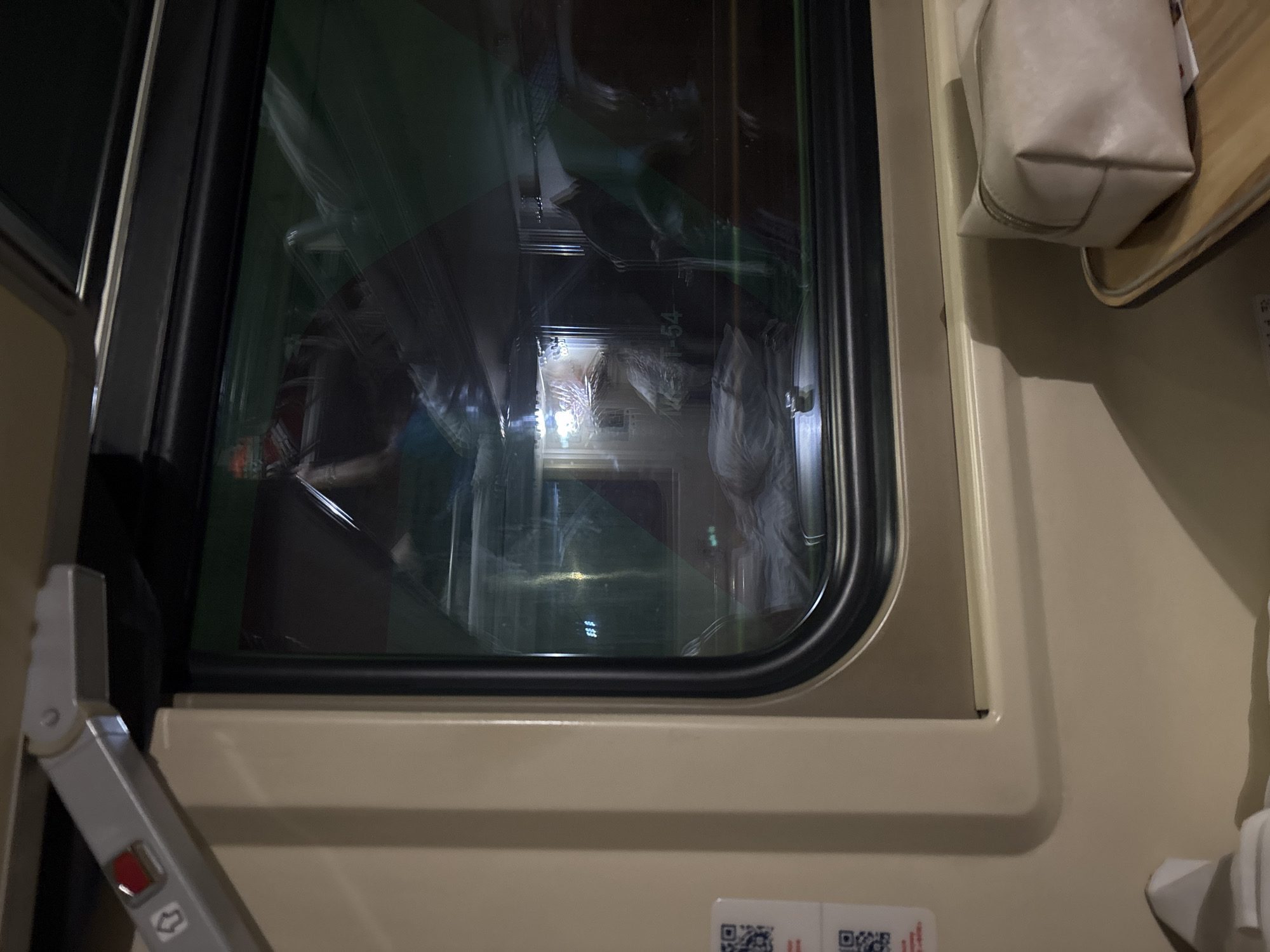 This image captures the interior of a train car at night, specifically located in the city of Tayshet, Russia. The primary subject is a rounded rectangular train window with a black frame, viewed from the inside of the compartment. The interior of the train features light beige/off-white wall paneling. In the upper left quadrant, a gray hinged mechanism with a visible red button and an upward-pointing arrow symbol is affixed to the wall. To the immediate left of the window, a white label displaying two distinct QR codes and some red text is visible. In the lower right of the frame, a light beige zippered pouch rests on a light-colored wooden pull-down table or tray. The window glass reflects elements from the opposite side of the train car's interior. These reflections include: a blurred individual wearing a garment with red and white stripes in the upper section; the alphanumeric text "M3T-54" near the center-bottom; and a heavily blurred figure appearing to be sleeping under a light-colored blanket or sheet on a lower bunk or seat. Numerous diffuse light sources from the interior are also reflected. A small metallic object, possibly a cup, is visible on a ledge beneath the reflected bunk. The environment outside the train is indiscernible due to darkness and strong internal reflections, indicating nighttime conditions. No direct actions or interactions are depicted.