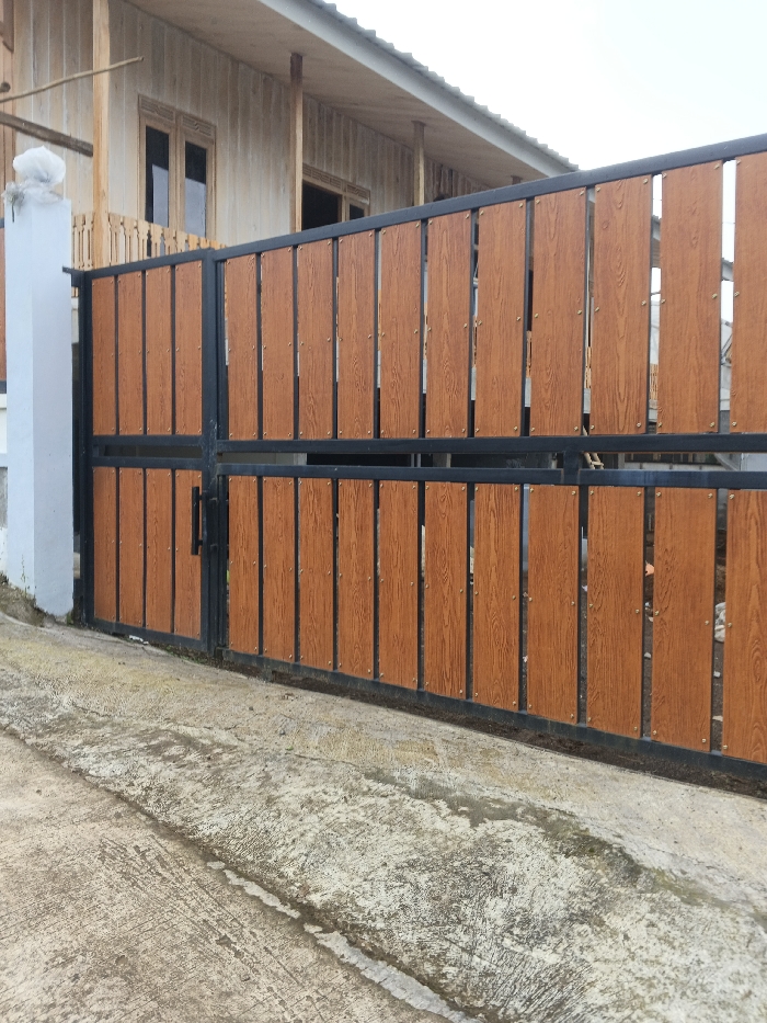 A gate made of dark metal and vertical wooden panels stands prominently. The panels are a light, grainy brown. The gate is attached to a white pillar on the left. Behind the gate, a wooden building is visible, with windows. The gate sits on a concrete surface with cracks. The overall view suggests an entrance to a house or property.