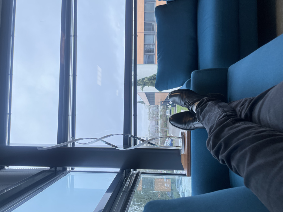 A first-person perspective image depicts the lower body of an individual resting on a teal sectional sofa, with their legs extended and feet crossed at the ankles. The individual wears dark grey jeans and black lace-up shoes. In the immediate foreground, the teal sofa's armrest and cushions are visible. Directly beyond the feet, positioned on a small wooden surface between the sofa and a large window, stands a tall, slender, reflective metallic sculpture or lamp with a double helix design. Through expansive, dark-framed windows, an overcast sky is visible, along with an outdoor urban or suburban environment in Montigny-le-Bretonneux, France. The scene outside includes multiple contemporary buildings with light-colored facades and dark-framed windows; one building prominently features an orange-brown horizontal band. A paved area, likely a parking lot, contains several parked vehicles, including at least one blue car and multiple white vehicles. Various trees and shrubbery, some appearing deciduous and others evergreen, are interspersed between the buildings and the paved areas.