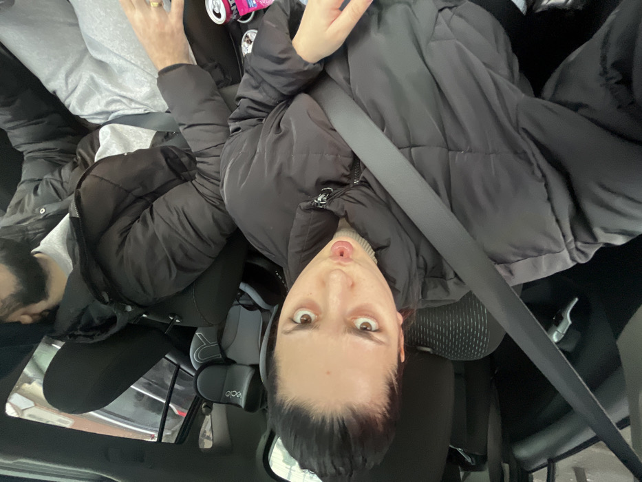 This image depicts the interior of a vehicle, potentially located in Souffelweyersheim, France. Two individuals are present. In the foreground, a female with dark hair pulled back is seated, wearing a dark puffer jacket over a light-colored ribbed sweater. She is secured by a grey seatbelt across her chest and lap. Her head is tilted, and she is looking directly at the camera with wide-open eyes and a pursed mouth, forming an "O" shape. Behind her, partially obscured, a male is seated. He is wearing a dark puffer jacket over a grey top and light grey pants. Only the lower portion of his face, including a dark beard, and his right arm are visible. A gold-colored ring is present on a finger of his right hand. His posture suggests he is resting or looking away from the camera. The vehicle's interior features dark-colored fabric seats. Through a window in the upper left, an indistinct exterior scene, possibly urban or residential, can be observed. On a surface to the right of the foreground subject, two beverage cans (one pink, one silver) and other small, unidentifiable objects are visible. A small grey and black object, possibly a car accessory, is situated behind the foreground subject's headrest.