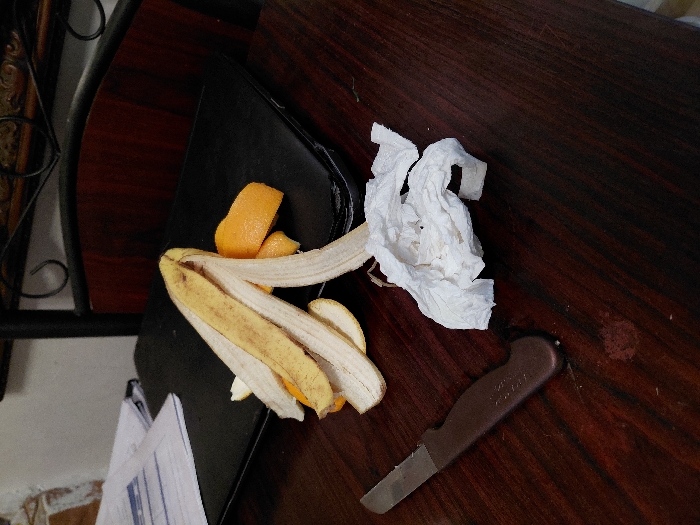 A partly peeled banana sits on a black surface, accompanied by scattered orange peels and crumpled white tissues. To the side, on a dark wood-grain surface, rests a small paring knife with a brown handle and a silver blade. The scene is brightly lit, possibly indoors, and includes part of a chair with wrought-iron detailing in the corner. A stack of white paper is visible at the bottom.