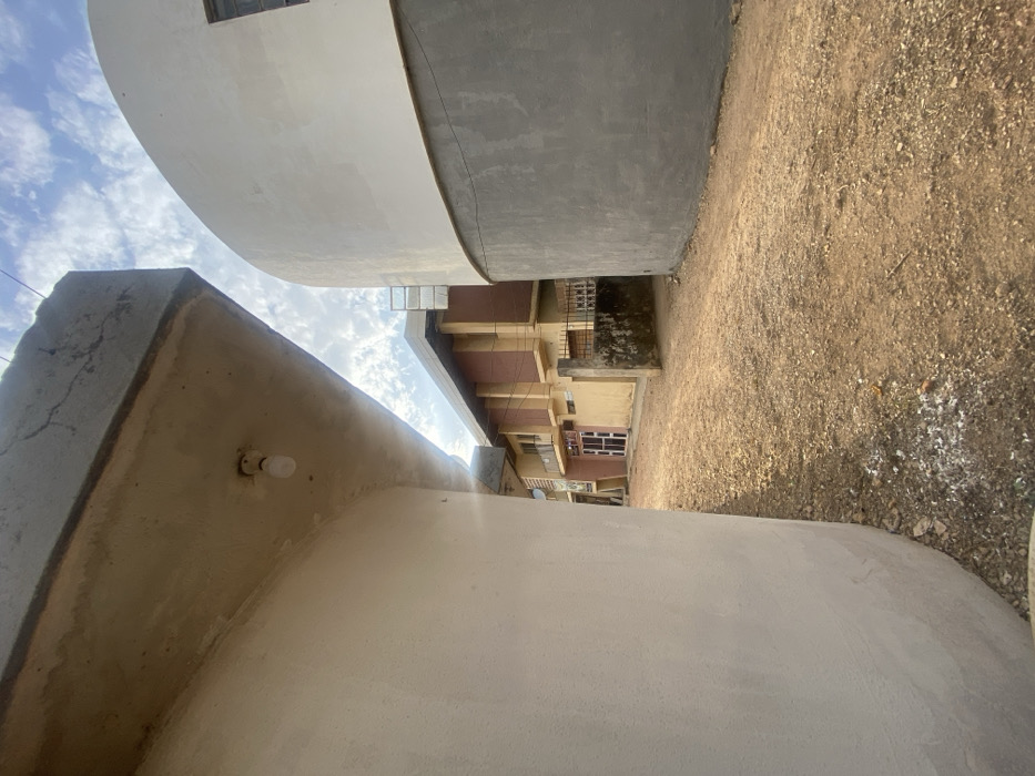 Two large, curved concrete structures dominate the foreground, their surfaces differing in color and texture. An exterior light fixture is visible on the closer structure. Between them, a glimpse of a multi-story building with orange and beige hues is seen. A strip of sky with scattered clouds is visible above. The ground is covered in a mix of dirt, gravel, and some white patches. The perspective is low, looking upwards between the structures.