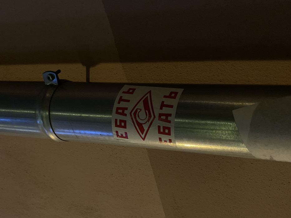 A silver pipe runs horizontally across a beige wall. The pipe is secured with a metal clamp. A sticker is placed on the pipe, featuring a red horseshoe-like shape inside a diamond, flanked by text. The text, written in red Cyrillic letters, reads "ЕБАТЬ." The right side of the pipe has a partially adhered white material that looks like tape or paper. The lighting suggests the image was taken indoors.