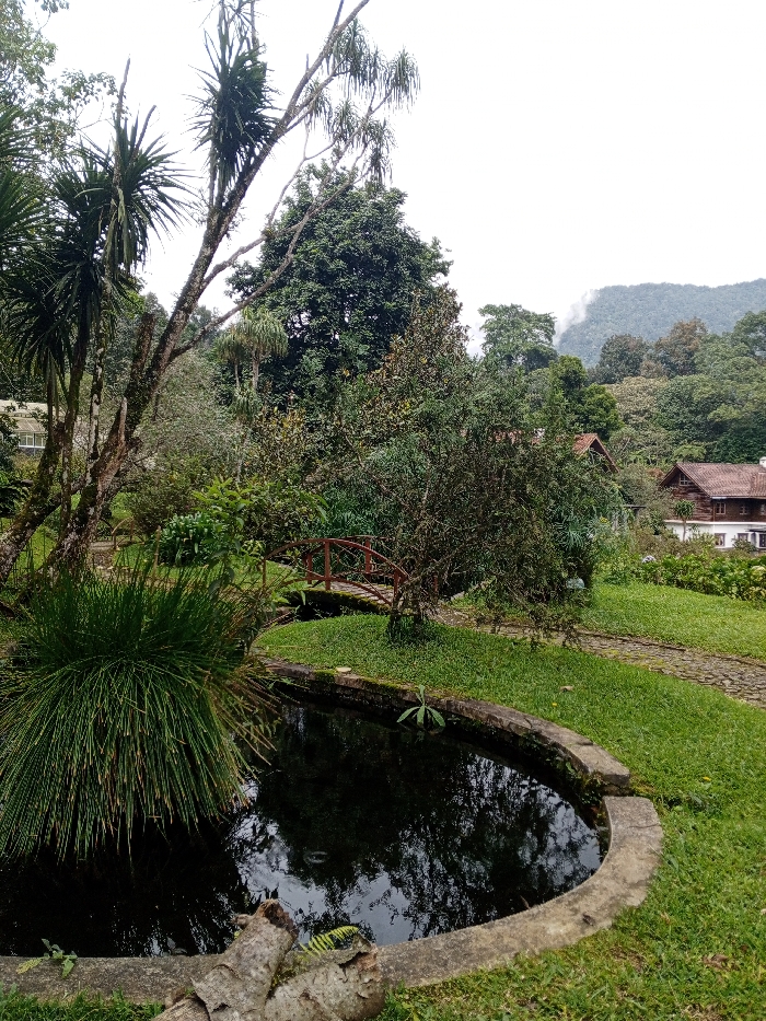 The scene depicts an overcast, lush, landscaped environment consistent with a mountain resort such as Bà Nà Hills in Da Nang, Vietnam. In the foreground, an irregularly shaped, dark-water pond with a concrete border reflects the sky and surrounding vegetation. A weathered log lies partially submerged or at the edge of the pond's left bank. Adjacent to the pond on the immediate left is a large, spiky clump of ornamental grass. In the mid-ground, a small, arched wooden bridge with reddish-brown railings crosses a grassy depression, leading to a manicured lawn area. A winding stone path, possibly cobblestone, ascends uphill on the right side of the image. The background is composed of densely forested mountains, with visible mist or low-hanging clouds near their peaks under a diffuse, overcast sky. Partially visible amidst the abundant greenery are several buildings featuring European chalet-style architecture with brown tiled roofs and lighter-colored walls. No individuals or animals are present, and no specific actions or interactions are depicted.
