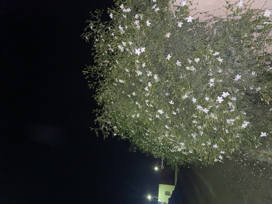 A night scene reveals a sprawling jasmine bush in full bloom, its countless white blossoms softly illuminated against the dark sky. The leaves and branches create a dense, textured canopy. Hints of a building and streetlights appear below the bush, adding a touch of urban setting to the otherwise natural tableau. The image captures the delicate beauty of the jasmine blossoms under the cloak of darkness.