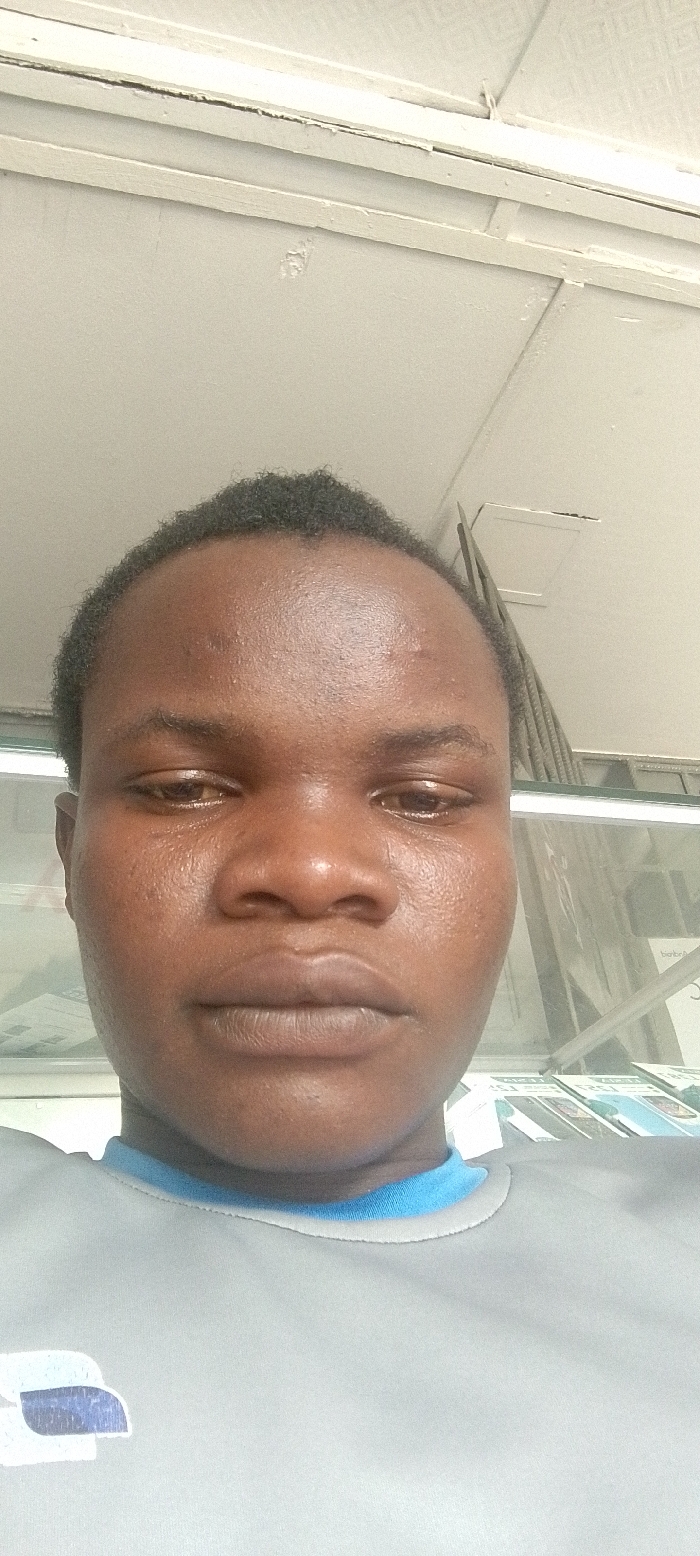 A close-up, frontal image depicts an individual with dark skin, short black hair, and dark eyes, maintaining a neutral expression. The individual wears a light grey crew-neck shirt with a visible light blue collar trim and a partial white and blue graphic on the lower left chest. The background, an indoor setting within Ajara, Nigeria, shows a light-colored ceiling with multiple visible seams and minor surface damage. To the right, a vertical support structure precedes a partially visible display case holding several items, possibly retail products, predominantly white and light blue. A horizontal light fixture is also partially visible on the right side of the background.