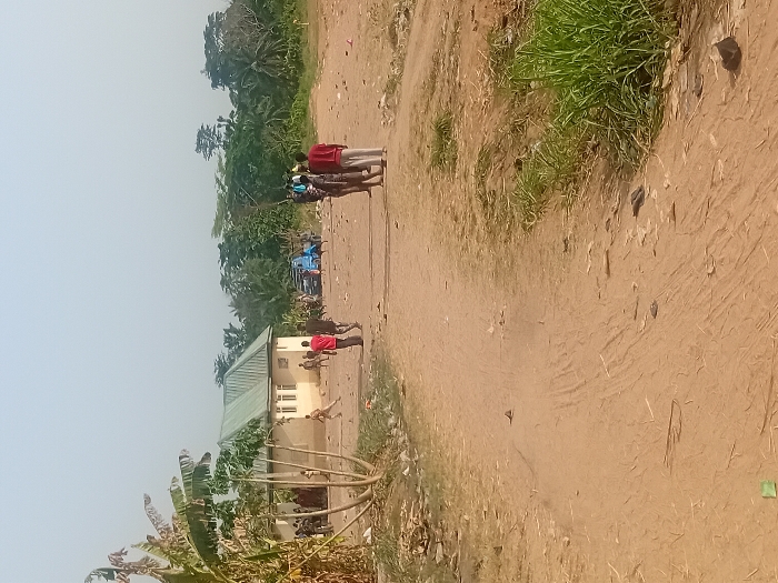 The image portrays an outdoor scene in Egbagu, Nigeria, characterized by an unpaved, reddish-brown dirt path dominating the foreground and extending into the midground